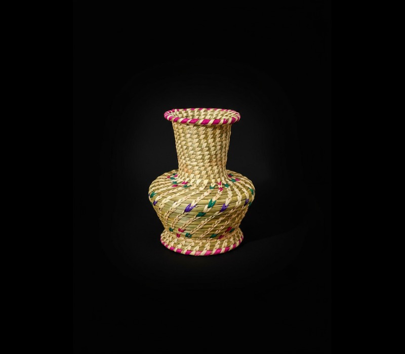 Elevate your decor with this handwoven flower vase crafted from Sabai grass and chain-stitched date palm leaves. With a base diameter of 3″ and standing 9″ tall, the vase features a graceful, flared design, bold colorful accents, and intricate natural textures that reflect artisanal craftsmanship. Ideal for fresh, dried, or artificial flowers, this piece blends sustainability and artistry, making it perfect for tabletops, entryways, or bedrooms. Biodegradable, lightweight, and sturdy, the vase is a charming eco-friendly statement for conscious living and supports traditional rural artisans.